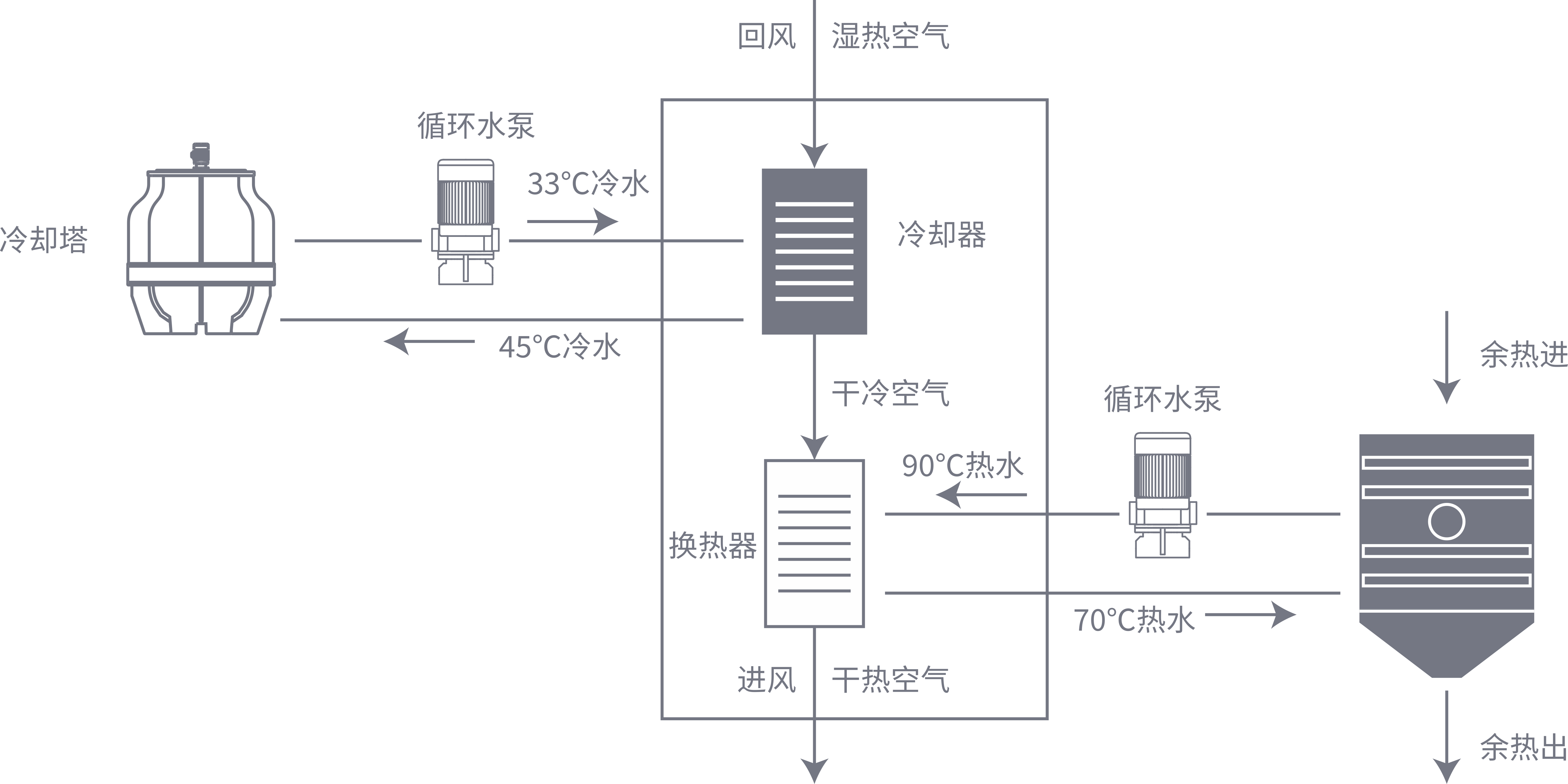 利用熱交換原理將廢熱(蒸汽、煙氣、熱水)通過管線接入廢熱回收裝置,產(chǎn)生低溫(100℃以下)干燥熱空氣通入密閉干化倉內(nèi),與其中運行的污泥進行濕度交換,將污泥中的水分帶出;同時,排出的濕空氣利用“冷卻塔+廢熱回收裝置”除濕,干燥后的空氣經(jīng)加溫處理后,再循環(huán)進入干化倉,實現(xiàn)廢熱利用。